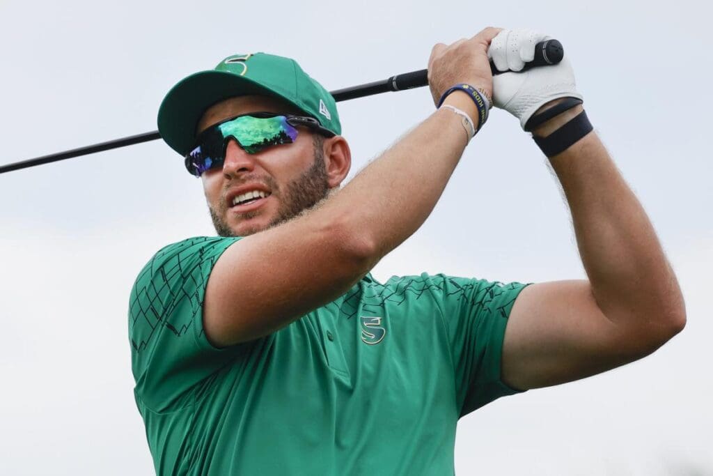 DeanBurmesteroftheStingergolfclubplayshisshotfromtheeighthteeduringthefinalroundofLIVGolfMiamigolftournamentatTrumpNationalDoral.Attheendoftheday,BurmesterwastheloneLIVGolferwhowillbeheadedtoPinehurstnextweek.